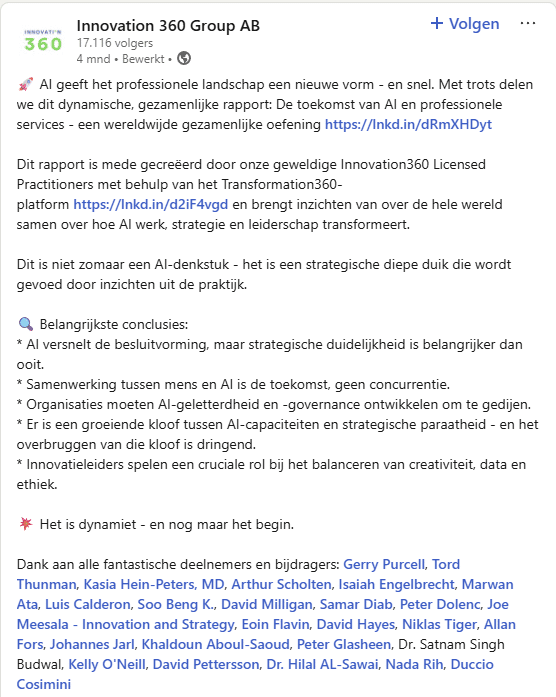 Alle geclusterde ideëen zijn na de campagne door een team geanalyseerd. Het team heeft drie challenges geformuleerd. Deze zijn terug te vinden op de website van de Innovation360 group: https://innovation360.com/a-global-collaborative-exercise-the-future-of-ai/