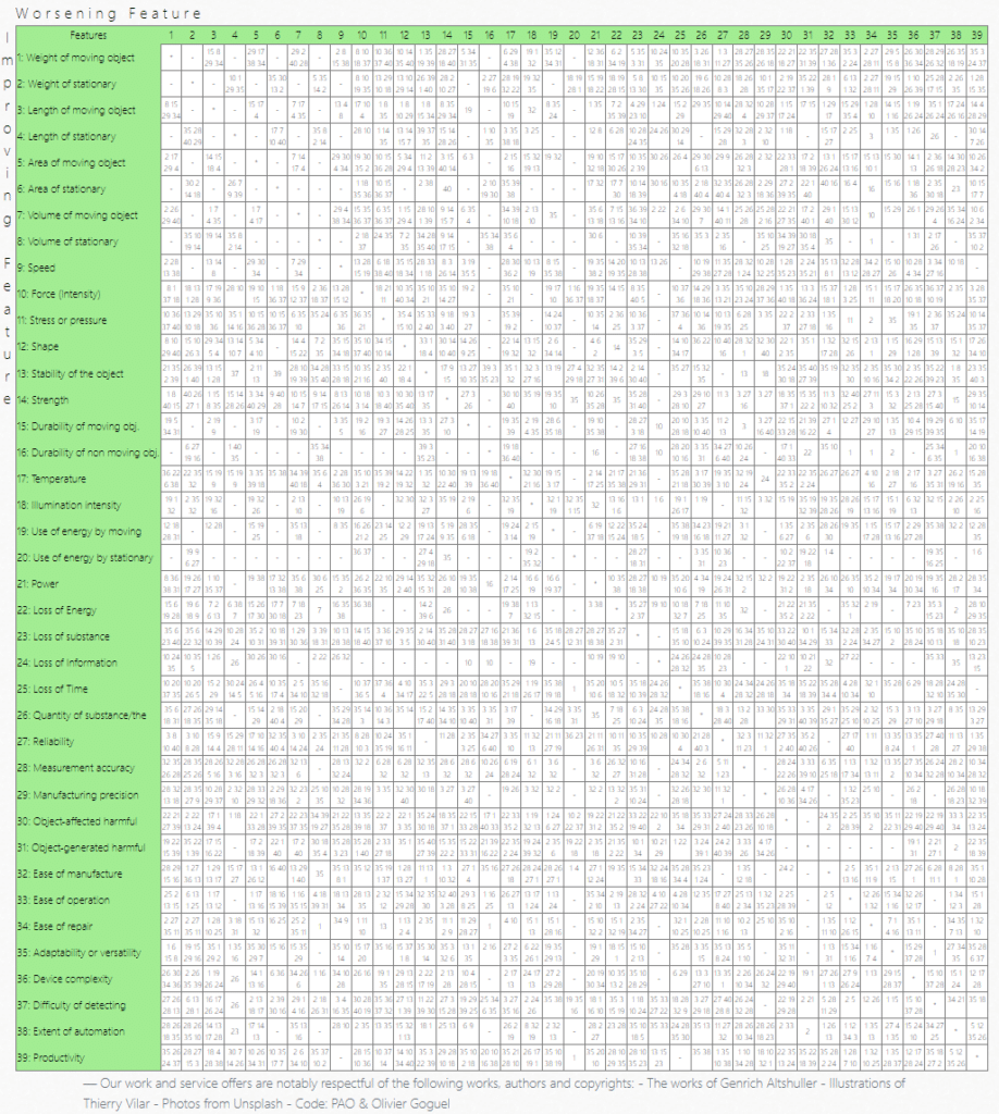 The Contradiction Matrix is a grid where the rows represent the improving features, and the columns represent the worsening features. You find the intersection of the row and column that corresponds to the specific contradiction you’re facing.